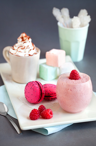 Accompagnez votre café gourmand d’un macaron framboise/violette, de guimauves légères et de framboises fraîches.