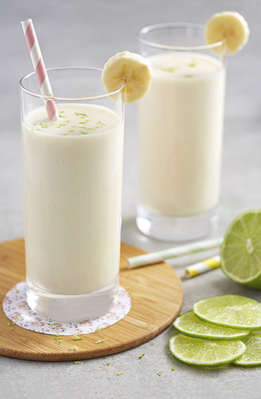Mixer la Pomme Banane Sans Sucres Ajoutés* avec le fromage blanc, le lait et la banane. Ajouter des zestes de citron vert et boire très frais.